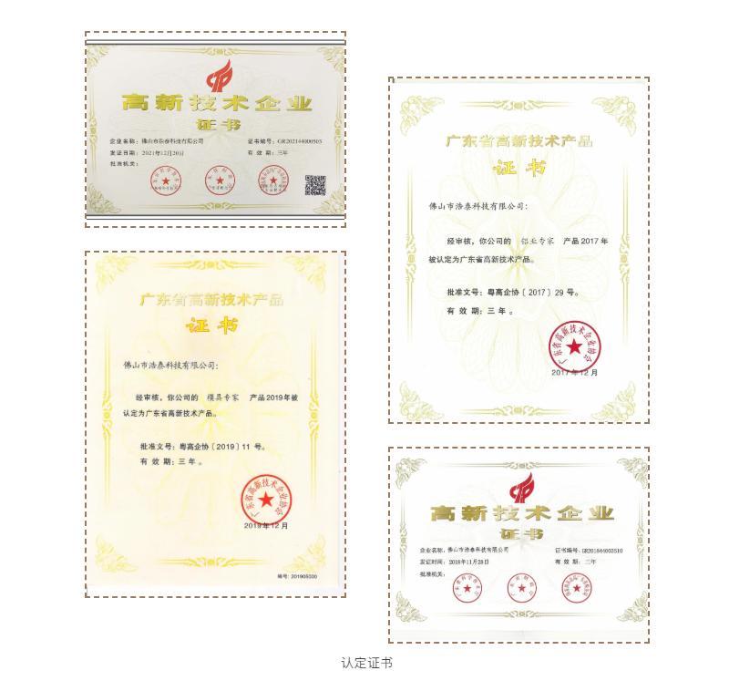 2017年,浩泰科技“鋁業專家”獲廣東省高新技術產品;2018年,浩泰科技通過廣東省高新技術企業認定;2019年,浩泰科技“模具專家”成為廣東省高新技術產品;2021年,浩泰科技復審通過廣東省高新技術企業認定,為企業創新奠定堅實的基礎。